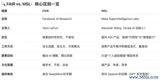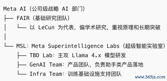 现时 Meta 里面的 AI 组织架构中,FAIR 和 MSL 是平行但定位完全不同的两个部门。